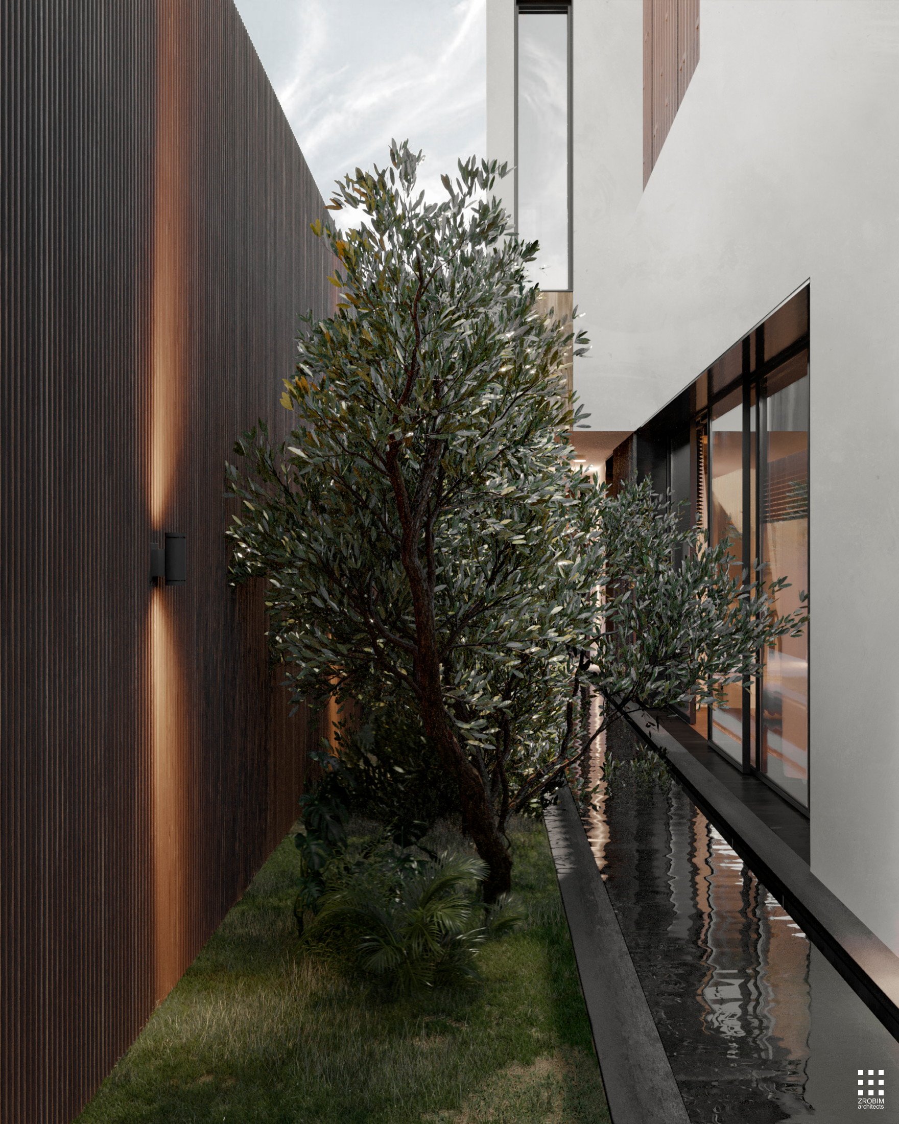 Główną specyfiką projektu jest gorący klimat, dlatego zastosowaliśmy biel w elewacji oraz drewno o różnych fakturach. Baseny, które pełnią zarówno funkcję dekoracyjną, jak i mogą być wykorzystywane lokalnie do kąpieli, zajmują dużą część powierzchni. Ostatnim elementem krajobrazu jest nie tylko trawa i krzewy, ale także drzewa wśród basenów. Drzewa działają zarówno na zewnątrz, jak i wewnątrz domu, ponieważ są doskonale widoczne przez panoramiczne okna pomieszczeń.