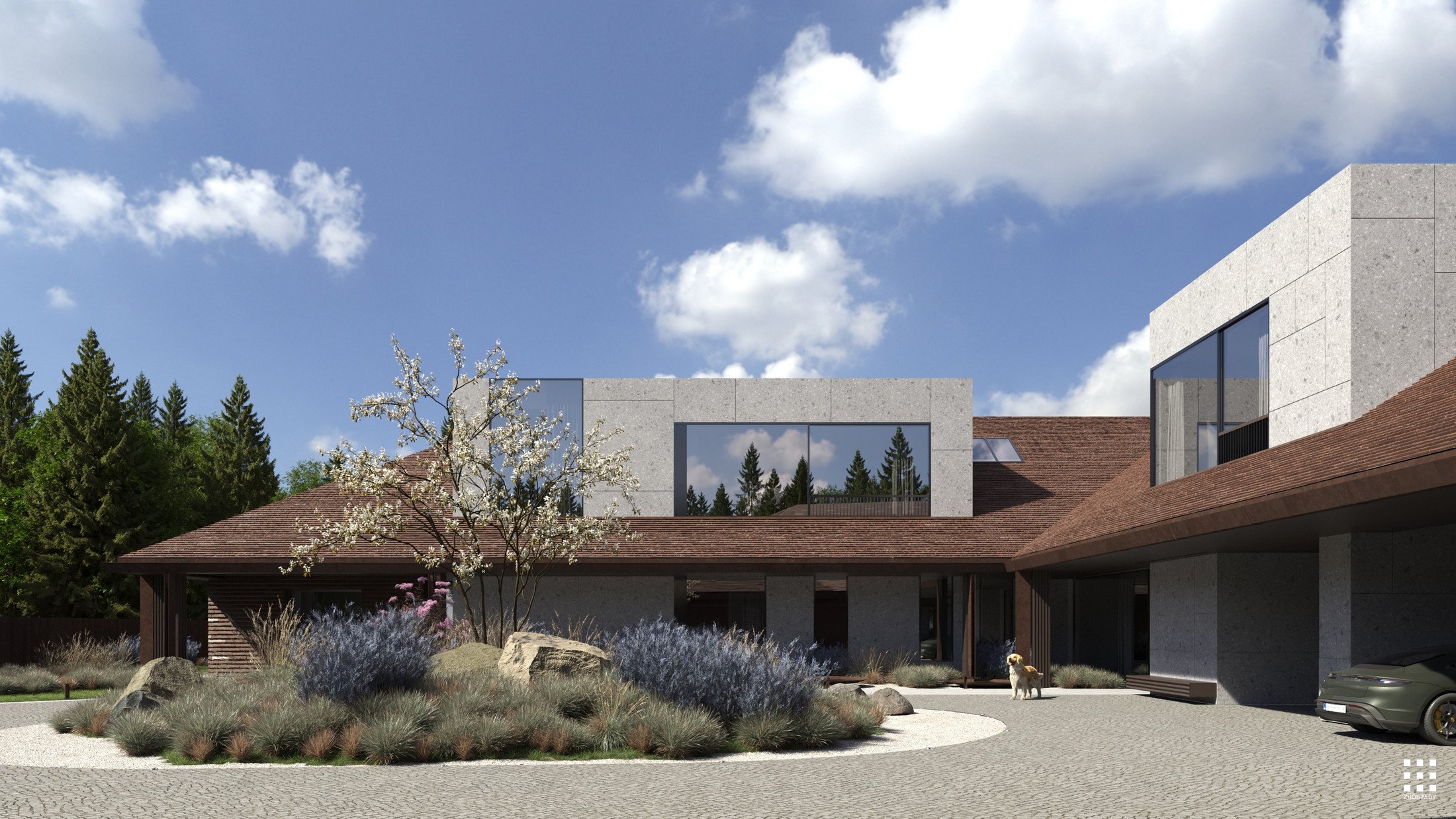 Projekt opiera się na subtelnym, wyrafinowanym eklektyzmie. Archetyp klasycznego dworu z dwuspadowym dachem został na nowo zinterpretowany i uzupełniony minimalistycznymi bryłami o kształcie prostopadłościanu, które tworzą złożoną, wielowarstwową kompozycję.