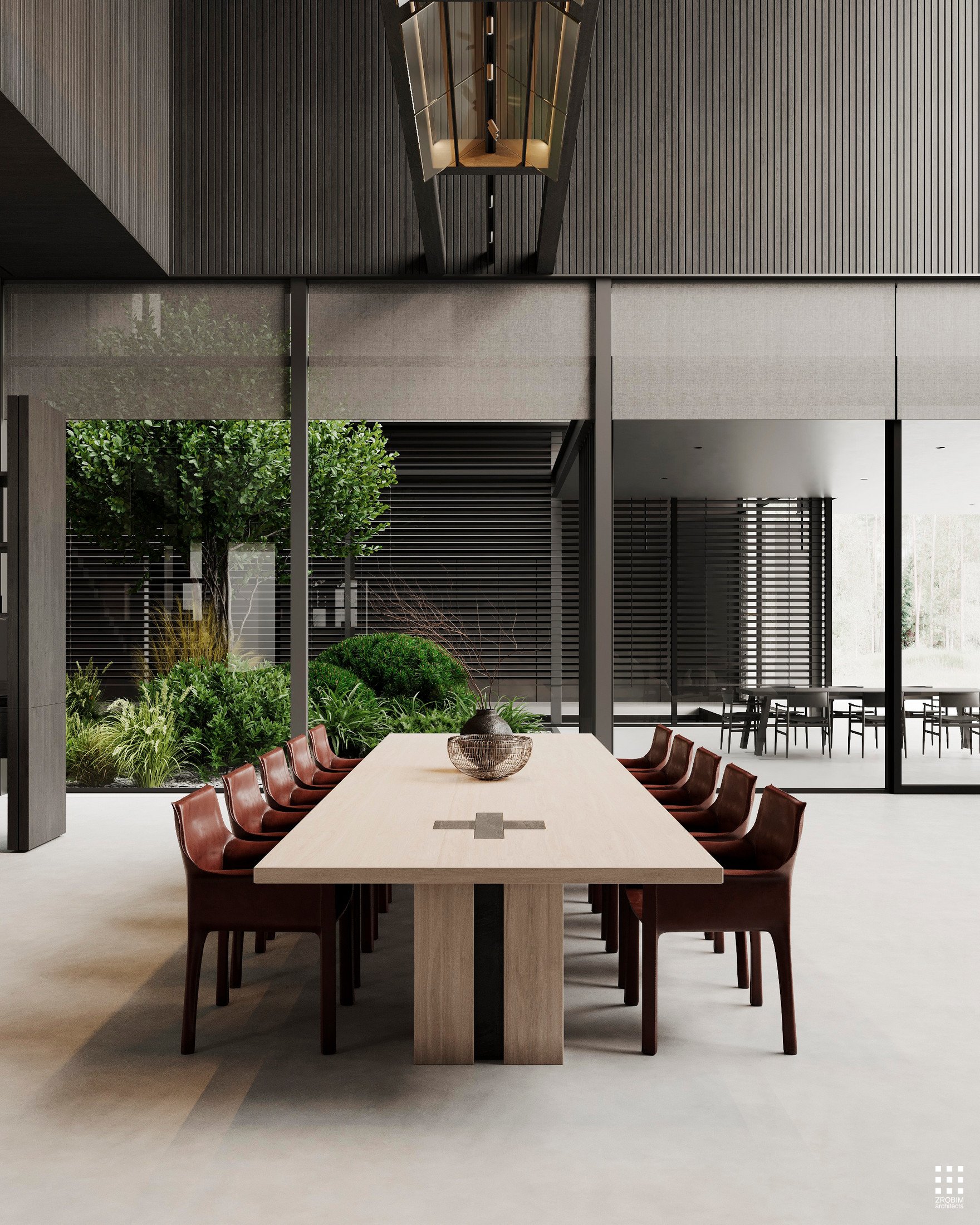Proporcje, skala i materialność elementów tworzą spójny system, w którym każdy detal wspiera ogólną koncepcję architektoniczną, a światło i faktura pełnią rolę narzędzi kompozycyjnych. Nawet przy ciemnej, nasyconej palecie barw, wnętrze pozostaje ciepłe, otulające i bogate wizualnie, tworząc przestrzeń do różnorodnych aranżacji.