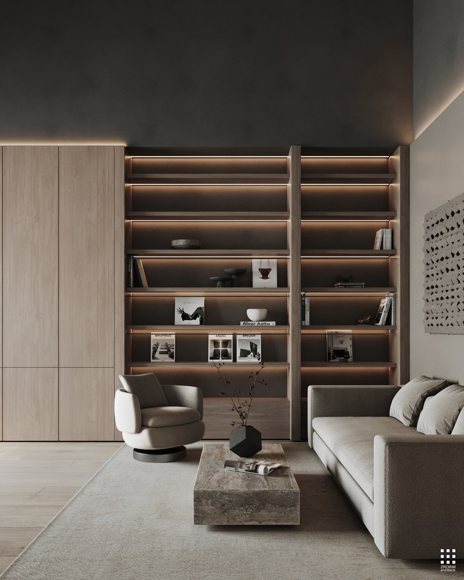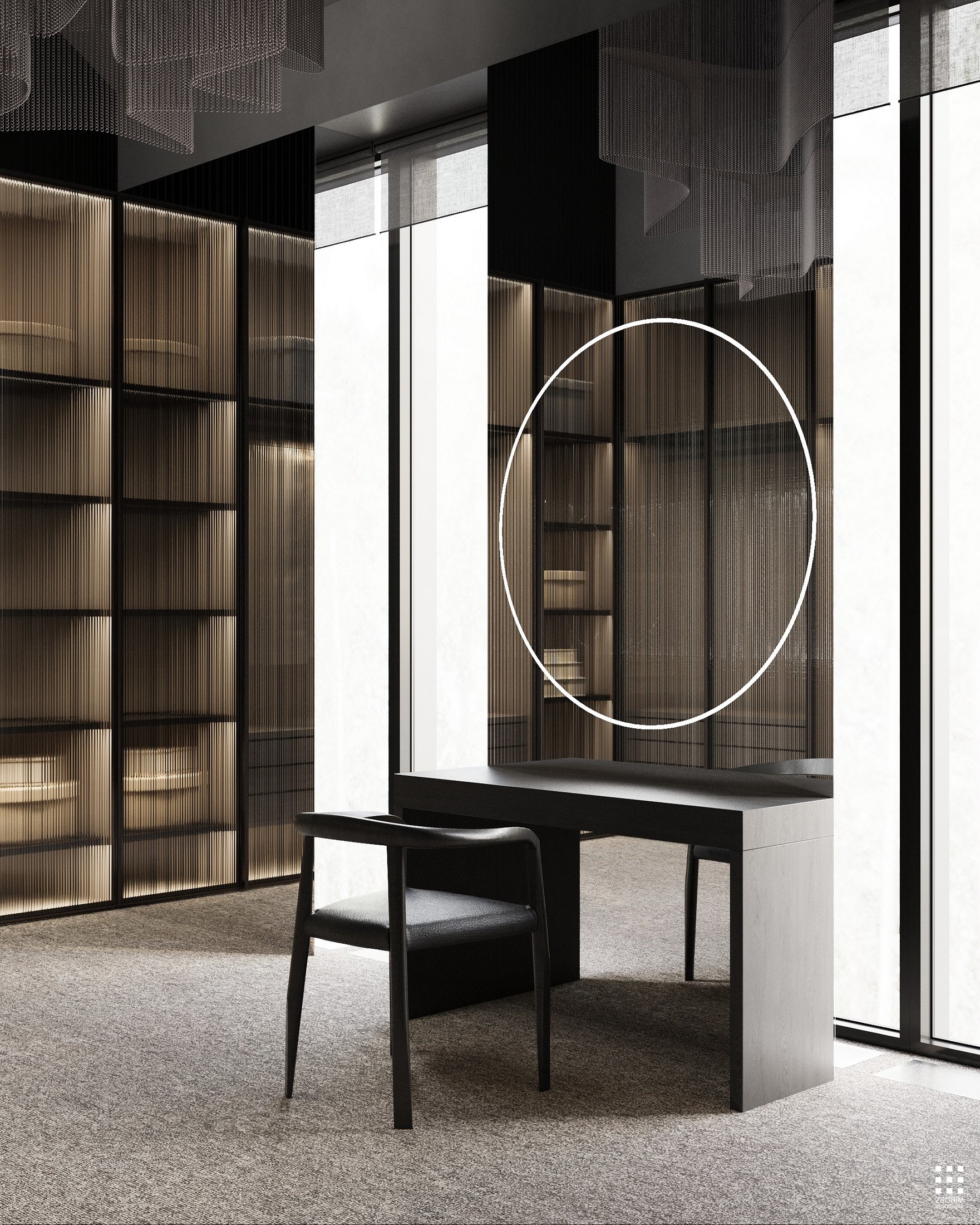 Intymne oświetlenie zaprojektowaliśmy w sposób ściśle określony: nie zalewa ono przestrzeni, lecz stopniowo ją odsłania, podkreślając linie architektoniczne, węzły kompozycyjne oraz kluczowe elementy mebli i wykończenia. Takie podejście tworzy zrównoważoną dynamikę przestrzenną, w której każdy element wydaje się proporcjonalny, a skala zachowuje harmonię między intymnością a monumentalnością.